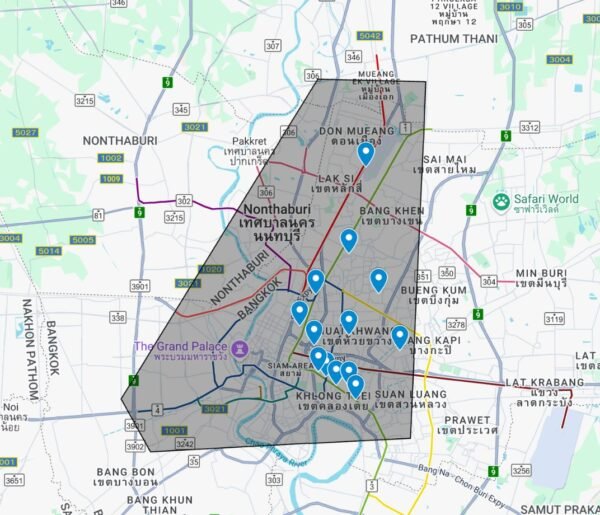 Asoke, Nana, Phrom Phong, Thonglor, Ekkamai, Phaya Thai, Ari, Chatuchak, Mo Chit, Ratchayothin, Kasetsart, Din Daeng, Ratchada, Huai Khwang, Lat Phrao, Ramkhamhaeng, Hua Mak, Lak Si, Don Mueang.